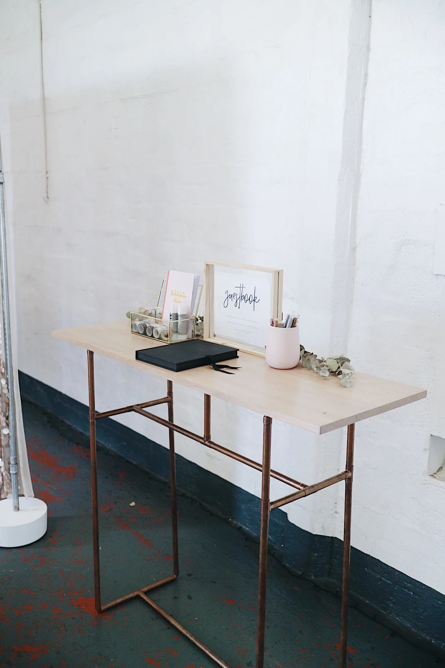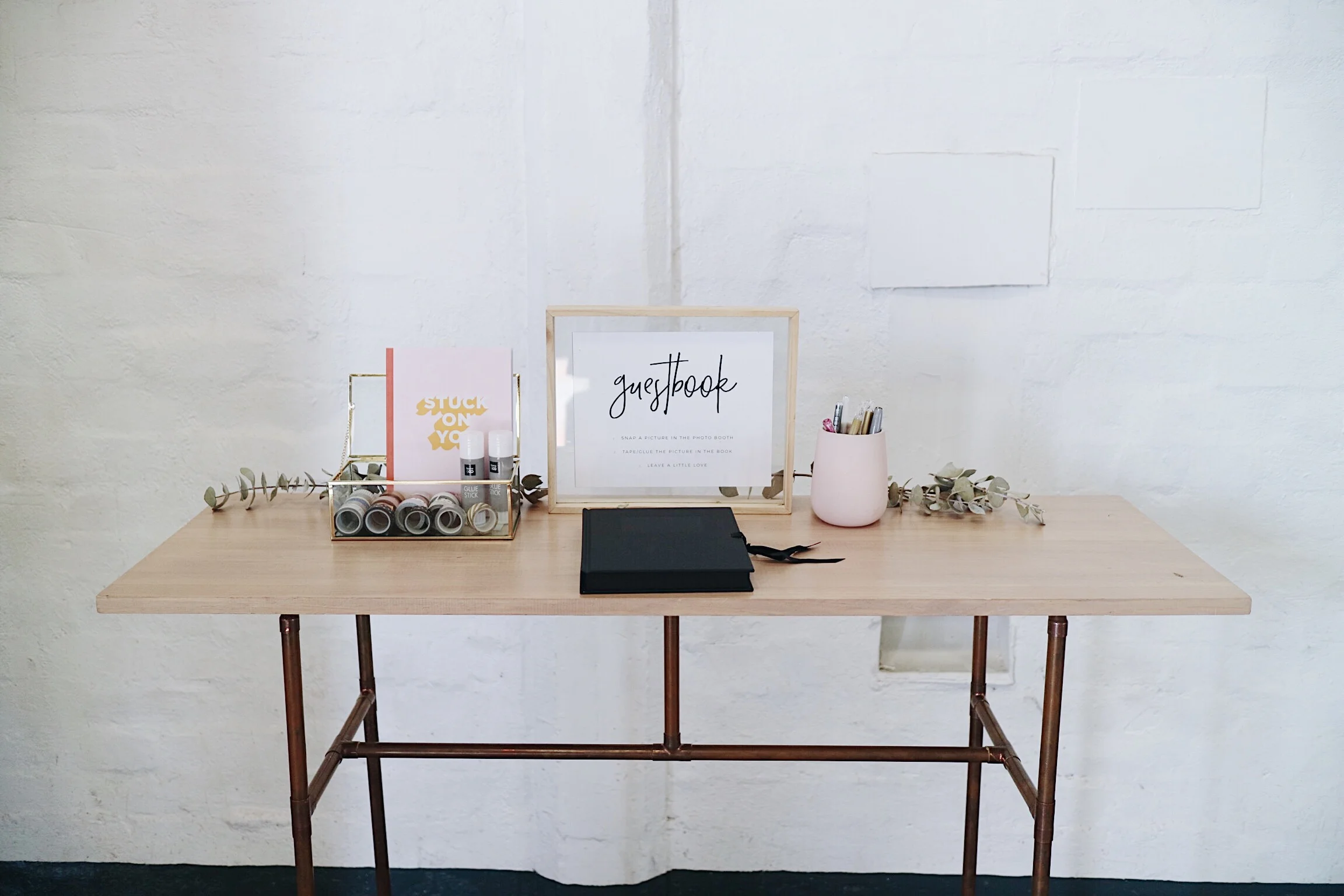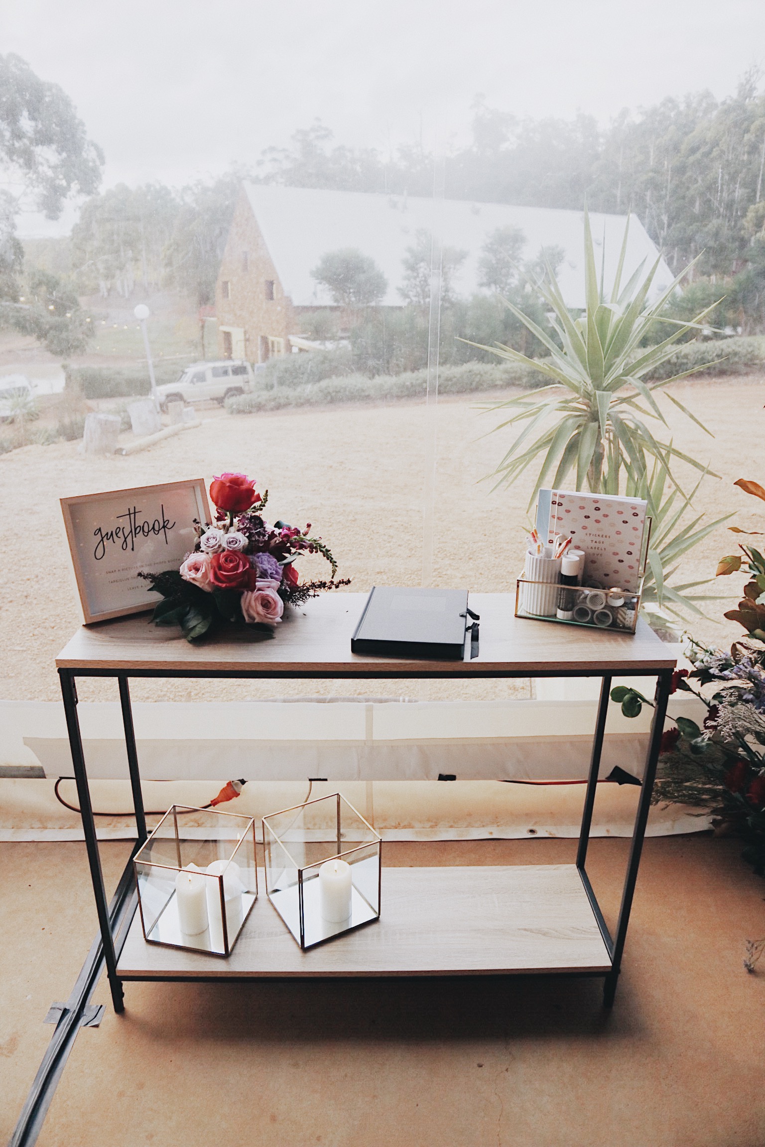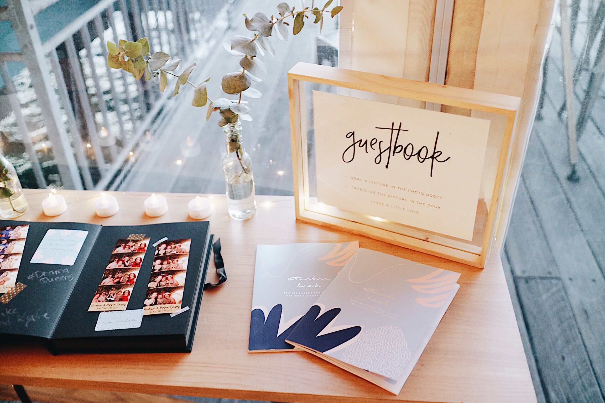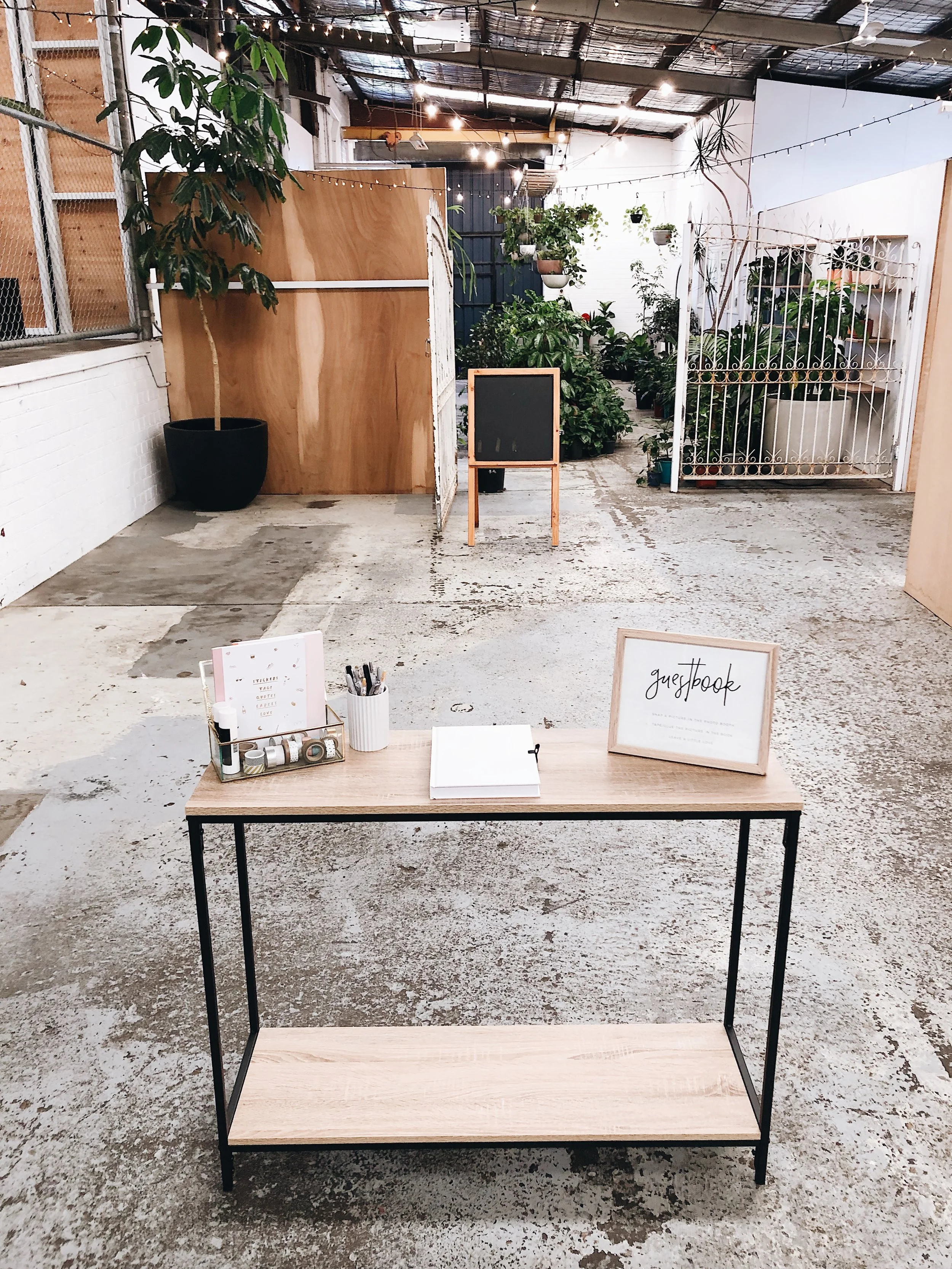 Wood top table with a framed guestbook sign. You are more than welcome to style the table how you like too!